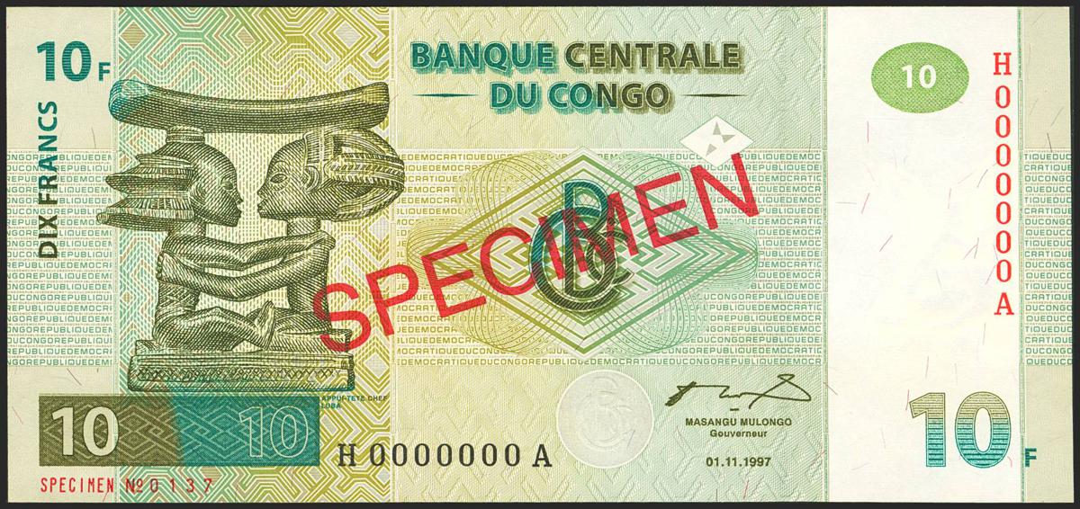 CONGO DEMOCRATIC REPUBLIC. 10 Francs. 1 November 1997. SPECIMEN and H0000000A. Central Bank. (Pick: 87s). Uncirculated.