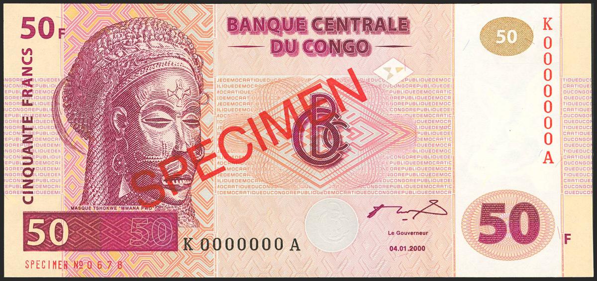 CONGO DEMOCRATIC REPUBLIC. 50 Francs. 4 January 2000. SPECIMEN and K0000000A. Central Bank. (Pick: 91s). Uncirculated.