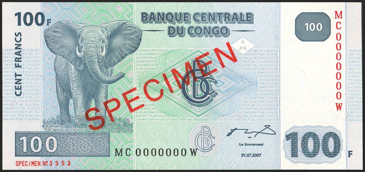 CONGO DEMOCRATIC REPUBLIC. 100 Francs. 31 July 2007. SPECIMEN and MC0000000W. Central Bank. (Pick: 98s). Uncirculated.