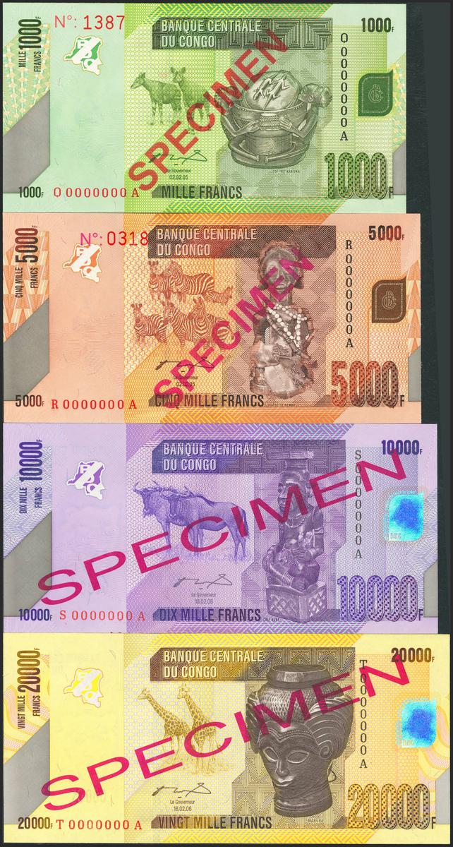 CONGO DEMOCRATIC REPUBLIC. Lot of 4 notes of 1000 Francs, 5000 Francs, 10000 Francs and 20000 Francs. 2 February 2005. SPECIMEN. Central Bank. (Pick: 101s, 102s, 103s, 104s). Uncirculated.