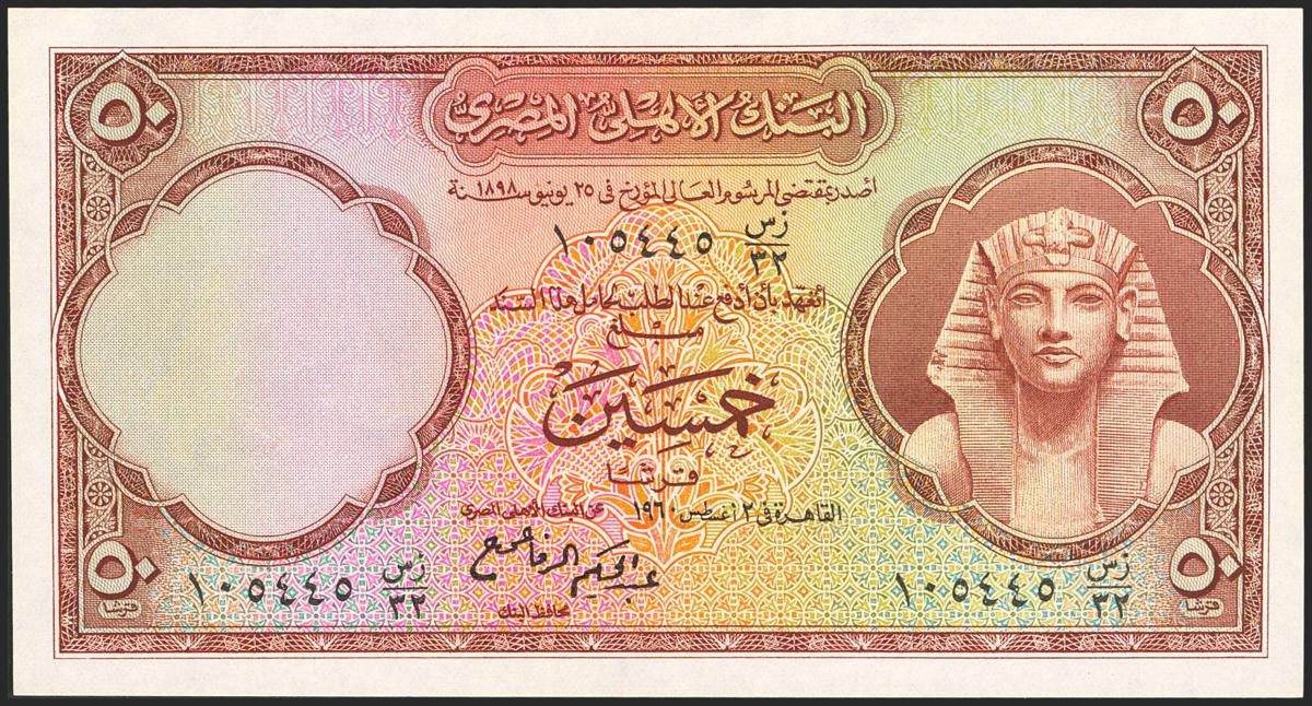 EGYPT. 50 Piastres. (1956ca). National Bank. (Pick: 29). Less than Uncirculated.