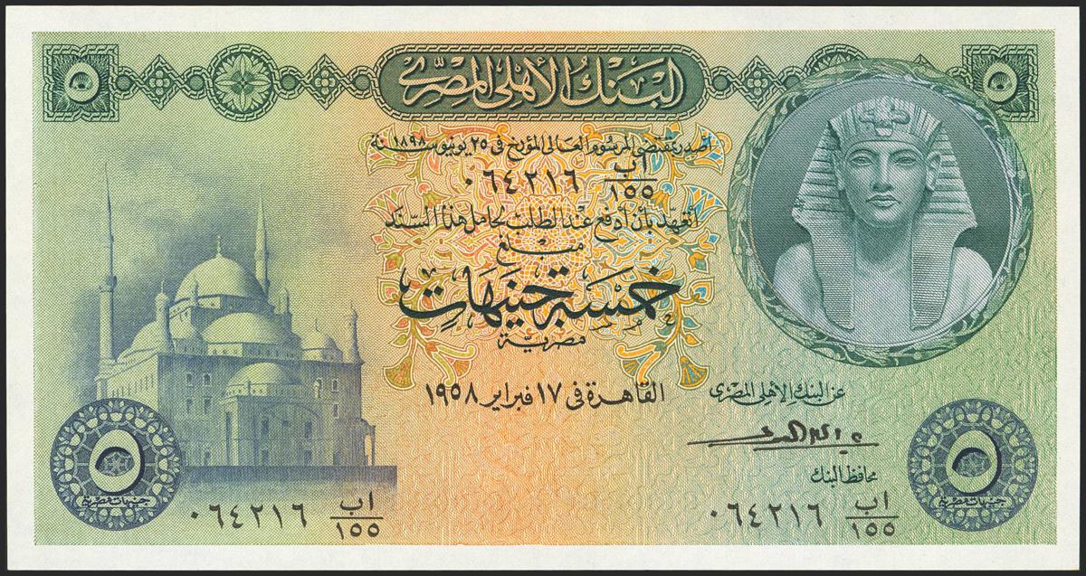 EGYPT. 5 Pounds. (1956ca). National Bank. (Pick: 31). Uncirculated.