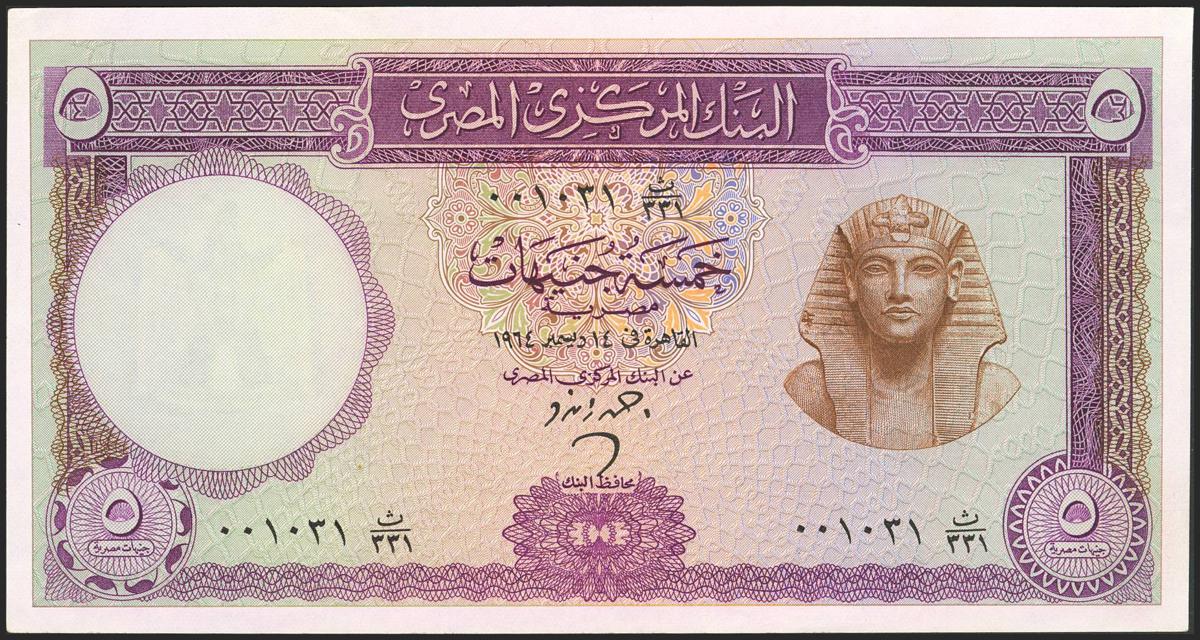 EGYPT. 5 Pounds. 1964. Central Bank. (Pick: 40). Less than Uncirculated.