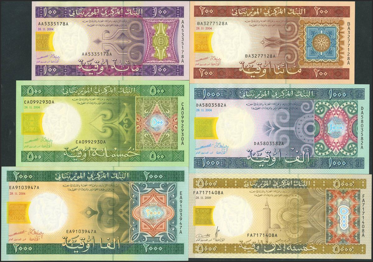 MAURITANIA. Lot of 6 notes of 100 Ouguya, 200 Ouguya, 500 Ouguya, 1000 Ouguya, 2000 Ouguya and 5000 Ouguya. (2004ca). Banque Centrale. (Pick: 10a, 11a, 12a, 13a, 14a, 15). Uncirculated.