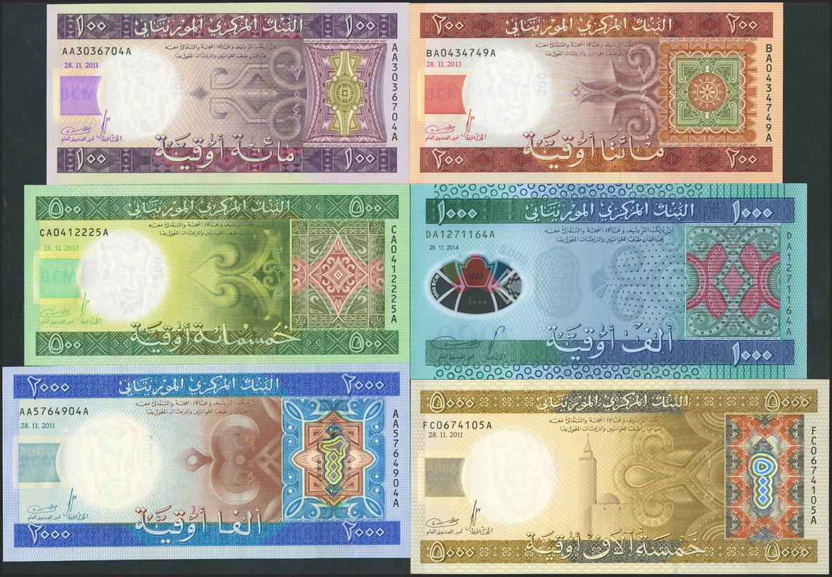 MAURITANIA. Lot of 6 notes of 100 Ouguya, 200 Ouguya, 500 Ouguya, 1000 Ouguya, 2000 Ouguya and 5000 Ouguya. (2013ca). Banque Centrale. (Pick: 16a, 17, 18, 19, 20, 21). Uncirculated.