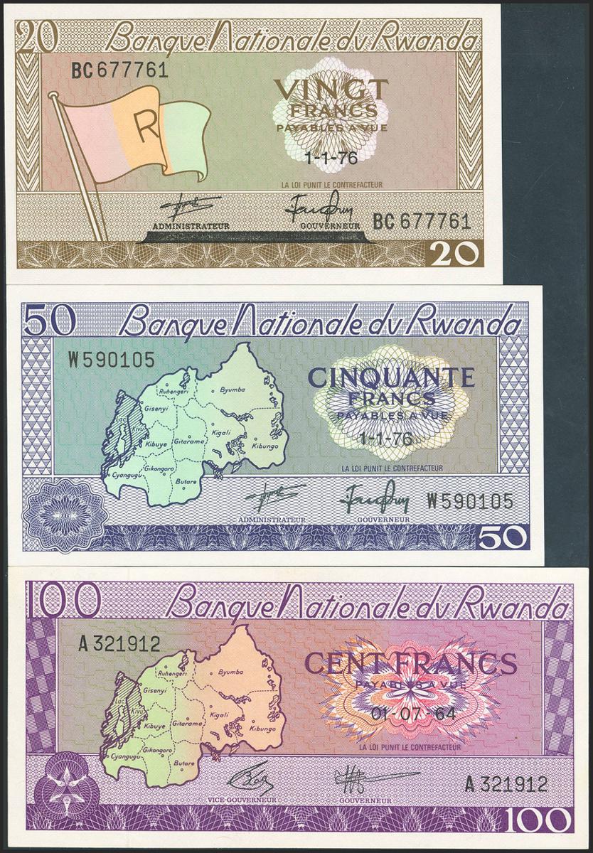 RWANDA. Lot of 3 notes of 20 Francs, 50 Francs and 100 Francs. (1964ca). Banque Nationale. (Pick: 6e, 7c, 8a). Uncirculated / About Uncirculated.