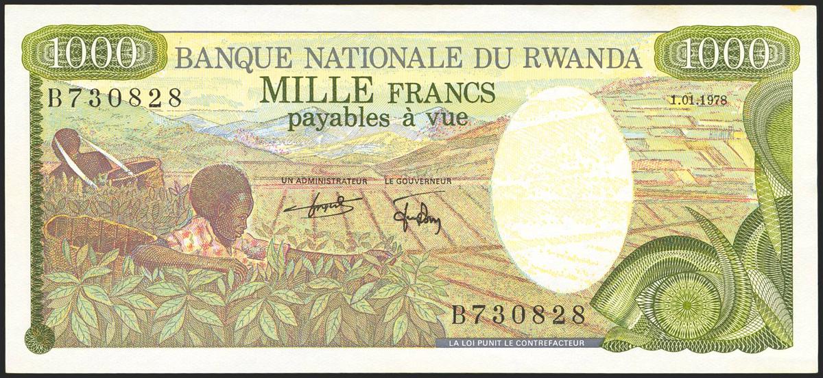RWANDA. 1000 Francs. 1 January 1978. Banque Nationale. (Pick: 14a). Less than Uncirculated. PMG SI.