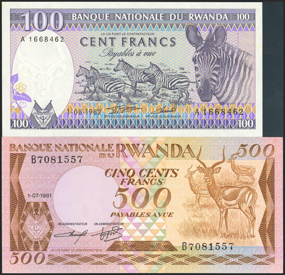 RWANDA. Lot of 2 notes of 100 Francs and 500 Francs. (1981ca). Banque Nationale. (Pick: 16 ,18). Less than Uncirculated / About Uncirculated.