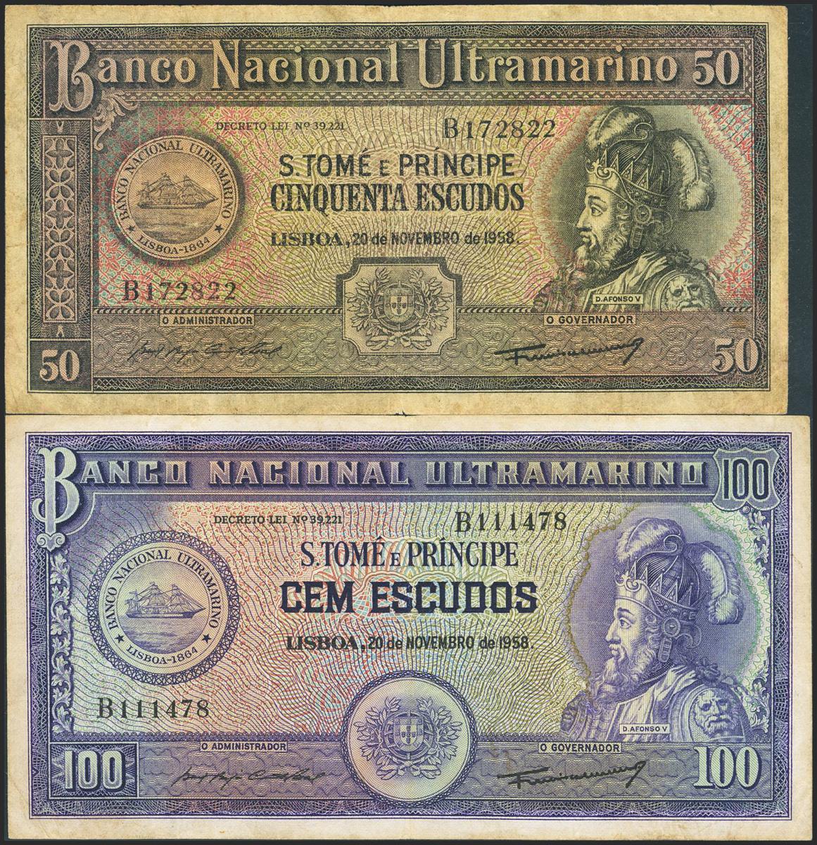 SAINT THOMAS AND PRINCIPE. Lot of 2 notes of 50 Escudos and 100 Escudos. 20 November 1958. Banco Nacional Ultramarino. (Pick: 37, 38). Very Fine / Very Good.
