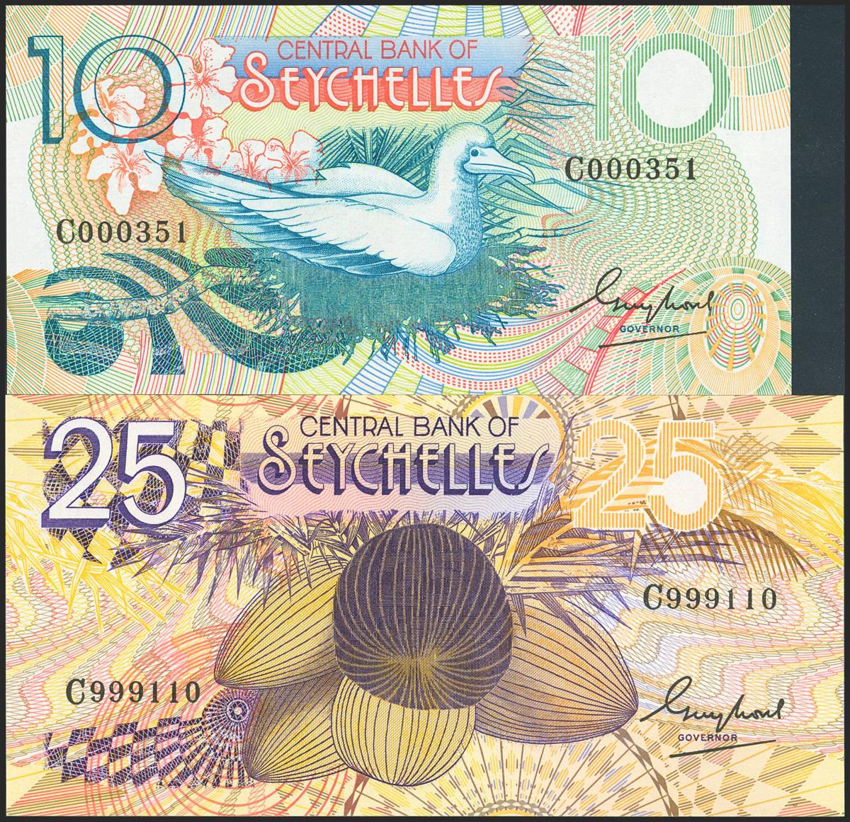 SEYCHELLES. Lot of 2 notes of 10 Rupees and 25 Rupees. (1989ca). Central Bank. (Pick: 28, 29). Uncirculated.