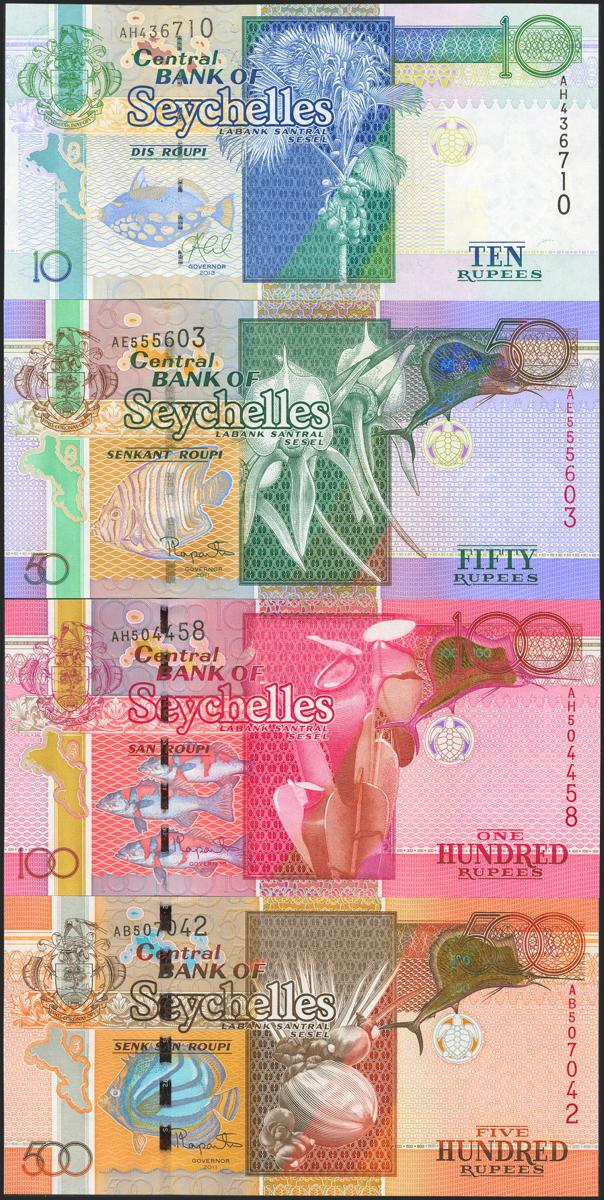 SEYCHELLES. Lot of 4 notes of 10 Rupees, 50 Rupees, 100 Rupees and 500 Rupees. (2011ca). Central Bank. (Pick: 42, 43, 44, 45). Uncirculated.