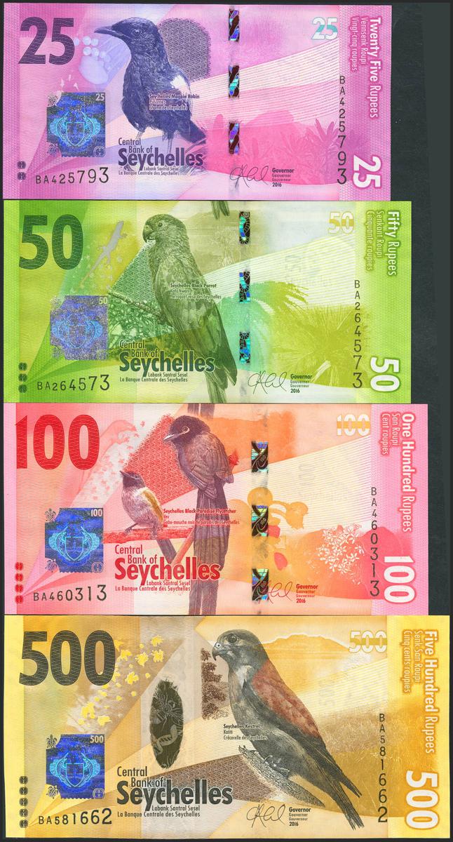 SEYCHELLES. Lot of 4 notes of 25 Rupees, 50 Rupees, 100 Rupees and 500 Rupees. (2016ca). Central Bank. (Pick: 48, 49, 50, 51). Uncirculated.