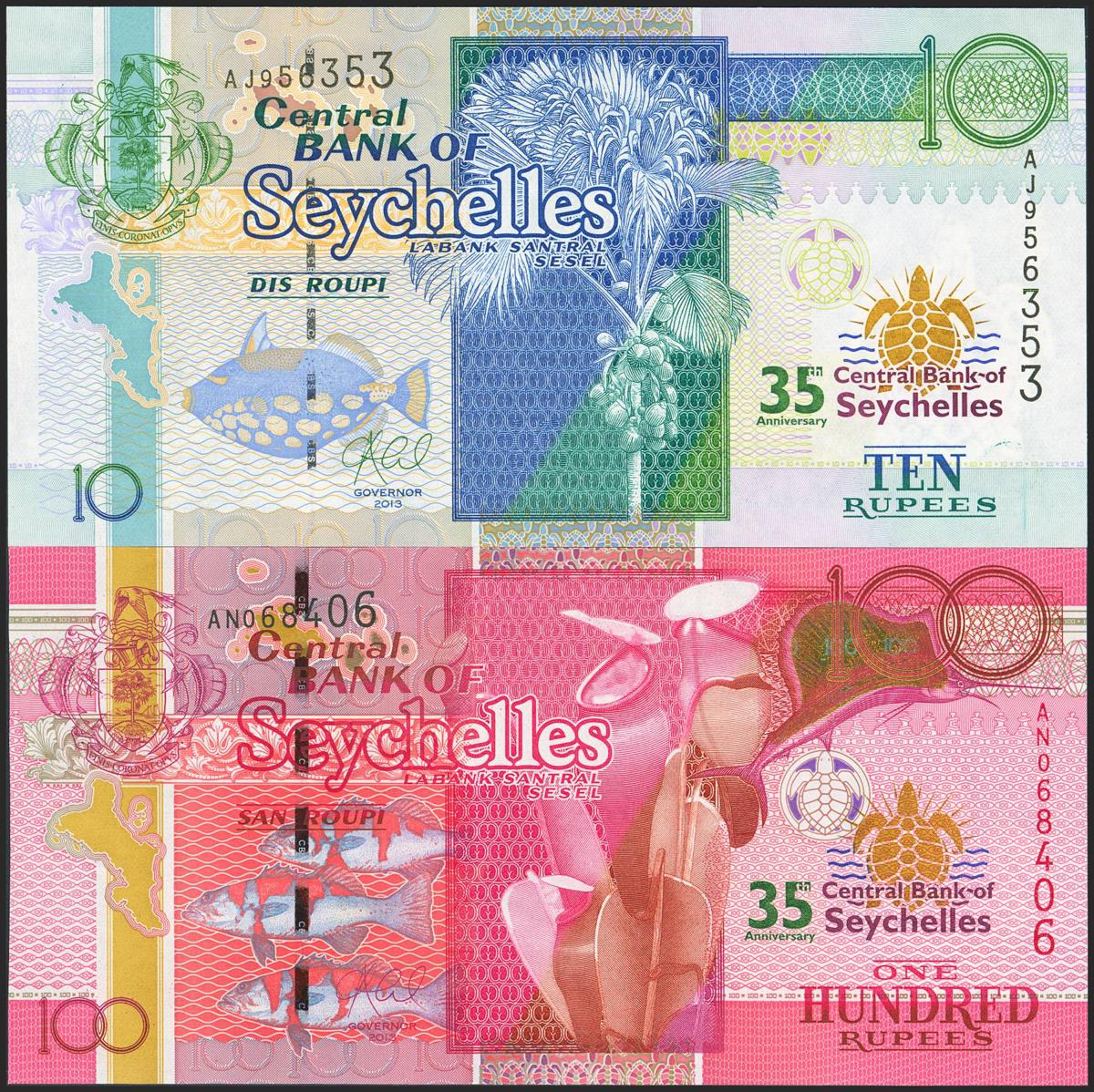 SEYCHELLES. Lot of 2 notes of 10 Rupees and 100 Rupees. (2013ca). Central Bank. (Pick: 46, 47). Uncirculated.