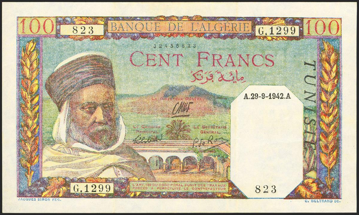 TUNISIA. 100 Francs. 29 September 1942. Banque de l'Algérie. (Pick: 13b). More than Very Fine.