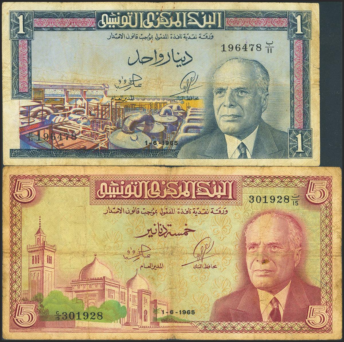 TUNISIA. Lot of 2 of notes 1 Dinar and 5 Dinars. 1 June 1965. Banque Centrale de Tunisie. (Pick: 63, 64). Fine.