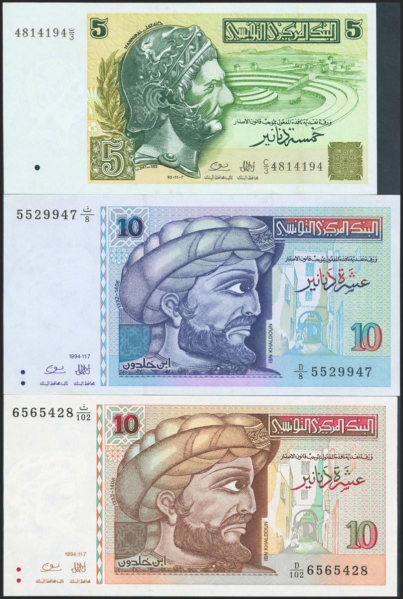TUNISIA. Lot of 3 notes of 5 Dinars and 10 Dinars (2). (2013ca). Banque Centrale de Tunisie. (Pick: 95, 96, 97). Uncirculated.