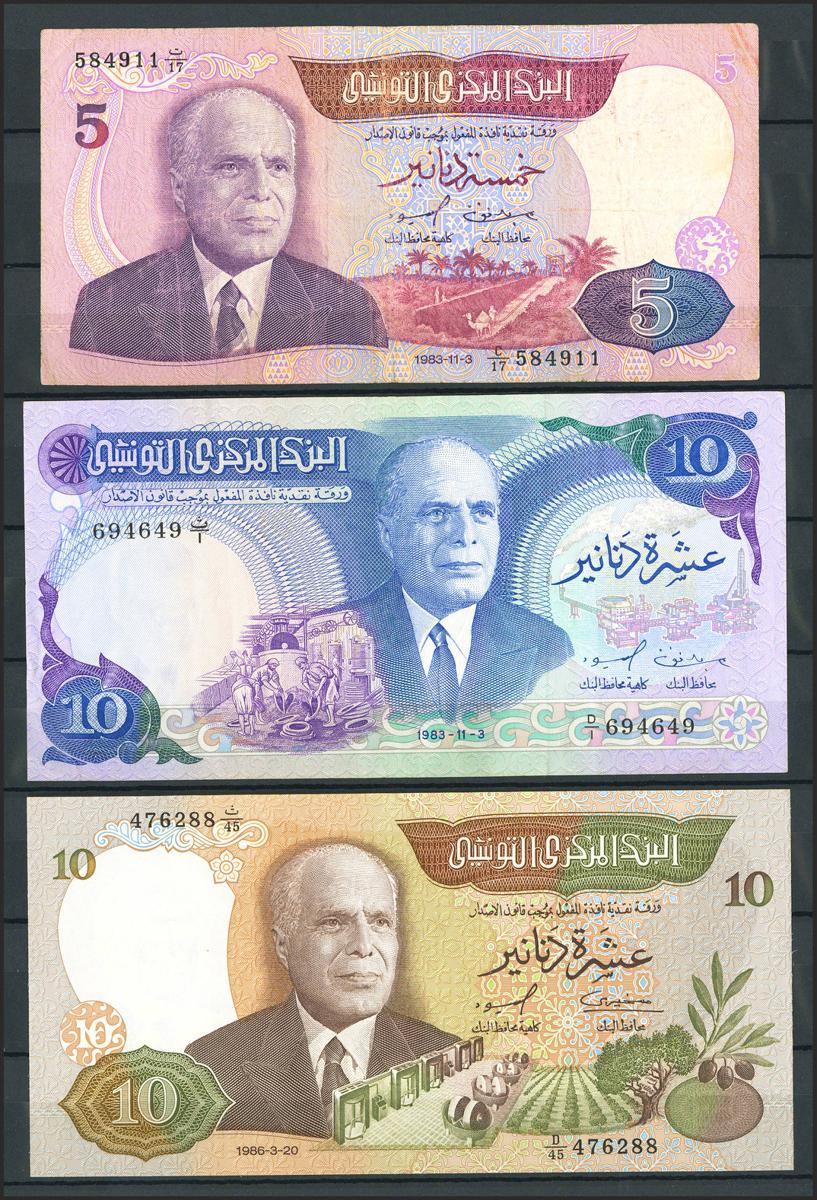 TUNISIA. Lot of 3 notes of 1 Dinar, 5 Dinars and 10 Dinars. 15 October 1980. Banque Centrale de Tunisie. (Pick: 74, 75, 76). Less than Uncirculated / About Uncirculated.