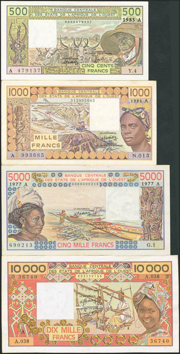 WEST AFRICAN STATES. Lot of 4 notes of 500 Francs, 1000 Francs, 5000 Francs and 10000 Francs. (1977ca). Banque Centrale des Etats de l'Afrique de l'Ouest. (Pick: 106Af, 107Ag, 108Aa, 109Ad). Less than Uncirculated / Fine.