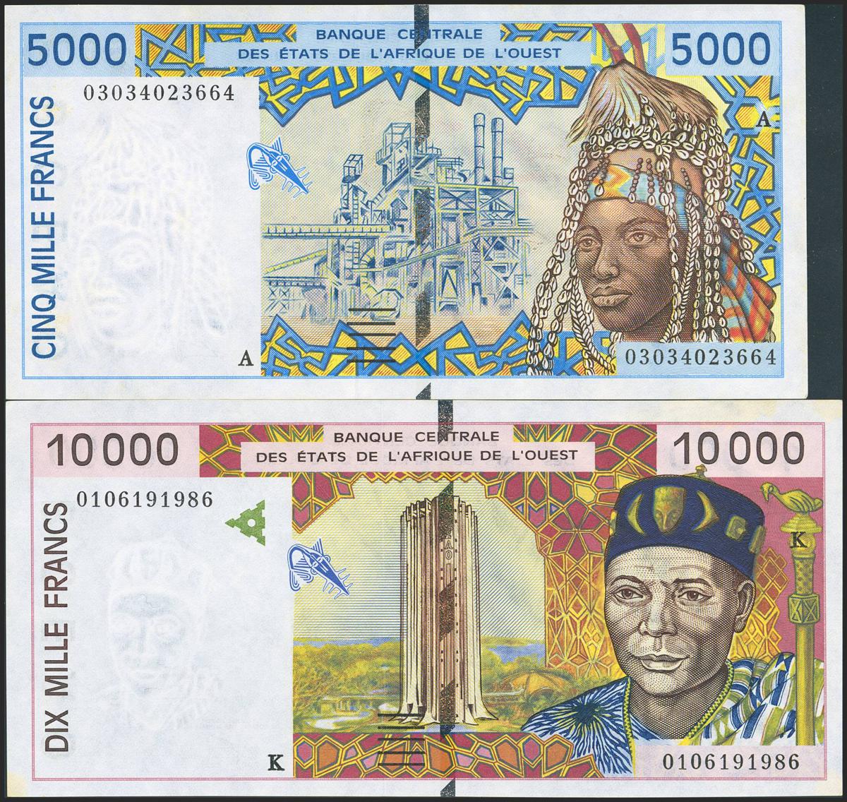 WEST AFRICAN STATES. Lot of 2 notes of 5000 Francs and 10000 Francs. (2003ca). Banque Centrale des Etats de l'Afrique de l'Ouest. (Pick: 113Am, 713Km). Stains. Less than Uncirculated.
