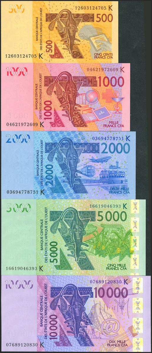 WEST AFRICAN STATES. Lot of 5 notes of 500 Francs, 1000 Francs, 2000 Francs, 5000 Francs and 10000 Francs. (2003ca). Banque Centrale des Etats de l'Afrique de l'Ouest. (Pick: 719Ka, 715Ka, 716Ka, 717Ka, 718Ka). Uncirculated.
