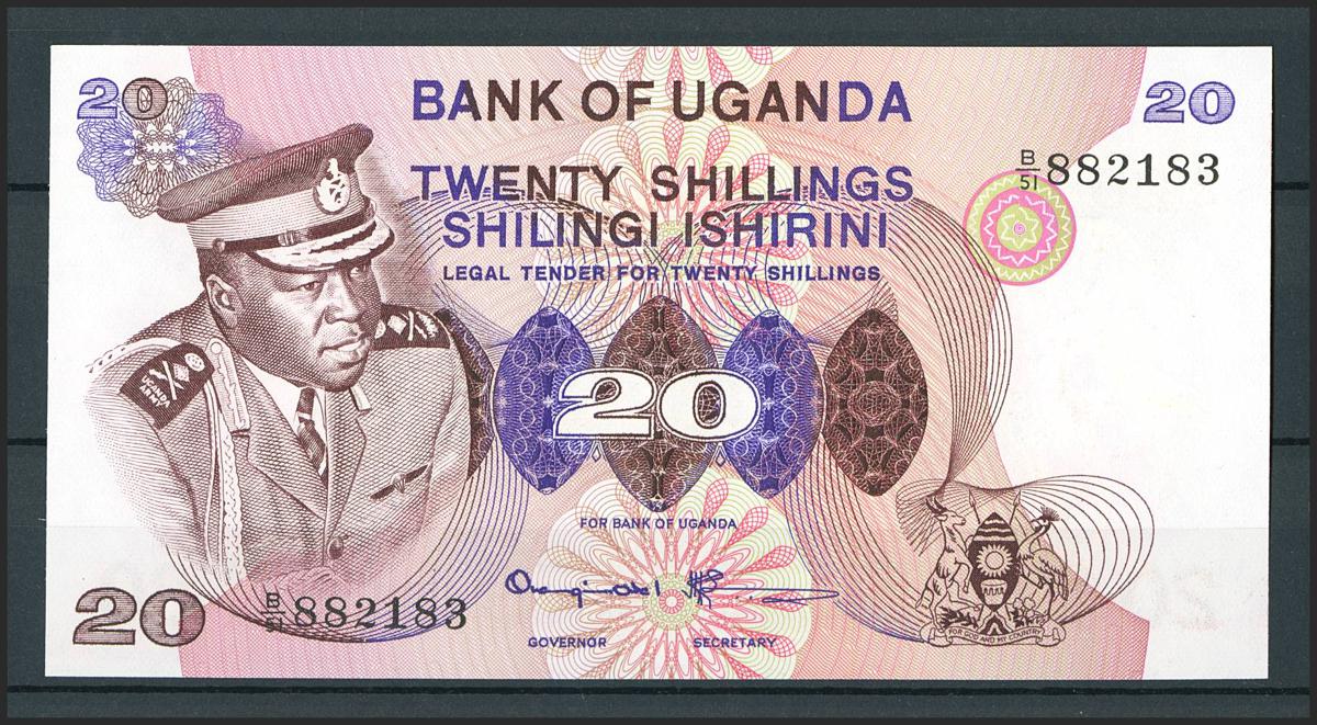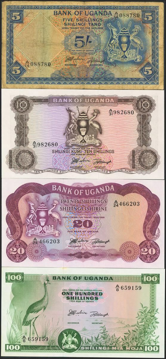 UGANDA. Lot of 4 notes of 5 Shillings, 10 Shillings, 20 Shillings and 100 Shillings. (1966ca). Bank of Uganda. (Pick: 1, 2, 3, 4). Uncirculated / Fine.