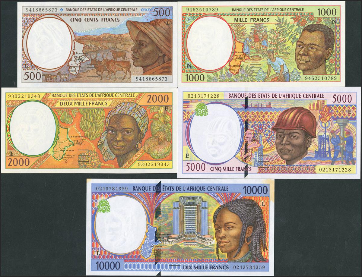 CENTRAL AFRICAN STAT. Lot of 5 notes of 500 Francs, 1000 Francs, 2000 Francs, 5000 Francs and 10000 Francs. (1993ca). Banque des Etats de l'Afrique Centrale. (Pick: 401Lb, 502Nb, 203Ea, 204Ea 405Lg). 10000 francs stains. Uncirculated / Less than Uncirculated.