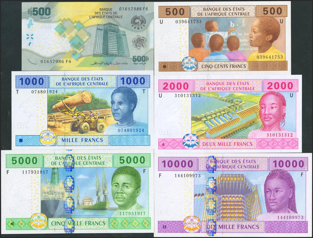 CENTRAL AFRICAN STAT. Lot of 6 notes of 500 Francs (2), 1000 Francs, 2000 Francs, 5000 Francs and 10000 Francs. (2002ca). Banque des Etats de l'Afrique Centrale. (Pick: 206U, 107T, 509F, 510F, 700). Uncirculated.