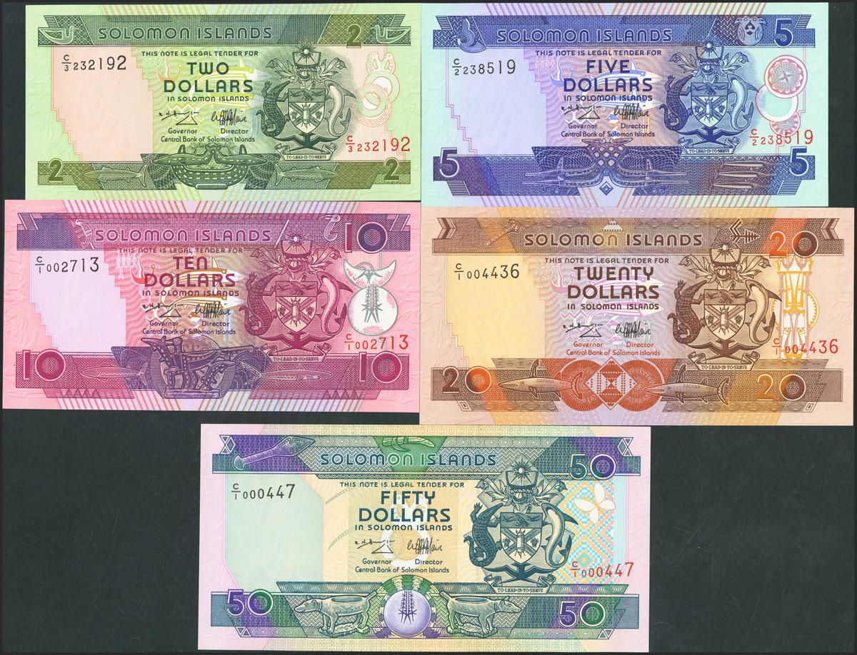 SOLOMON ISLANDS. Set of 5 notes of 2 Dollars, 5 Dollars, 10 Dollars, 20 Dollars and 50 Dollars. (1986ca). Central Bank. (Pick: 13, 14, 15, 16, 17). Uncirculated.