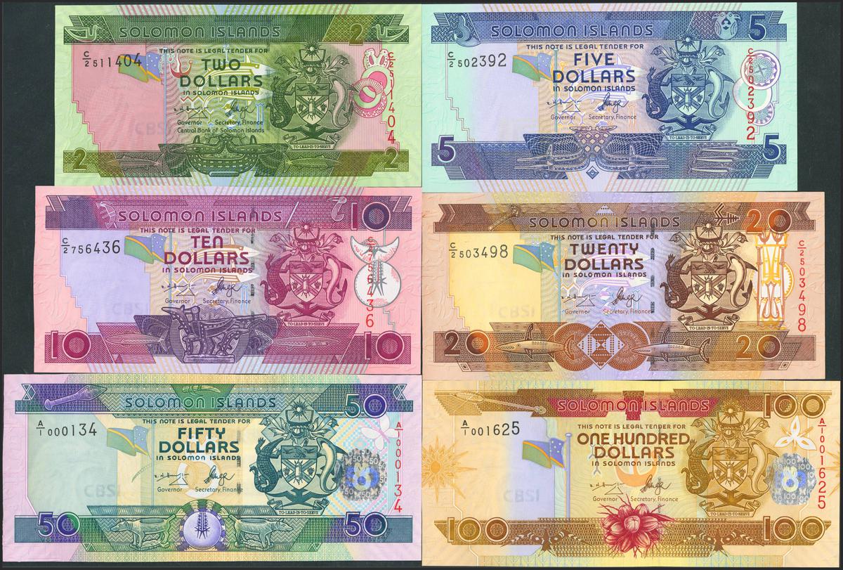 SOLOMON ISLANDS. Set of 6 notes of 2 Dollars, 5 Dollars, 10 Dollars, 20 Dollars, 50 Dollars and 100 Dollars. (2004ca). Central Bank. (Pick: 25, 26, 27, 28, 29, 30). Uncirculated.
