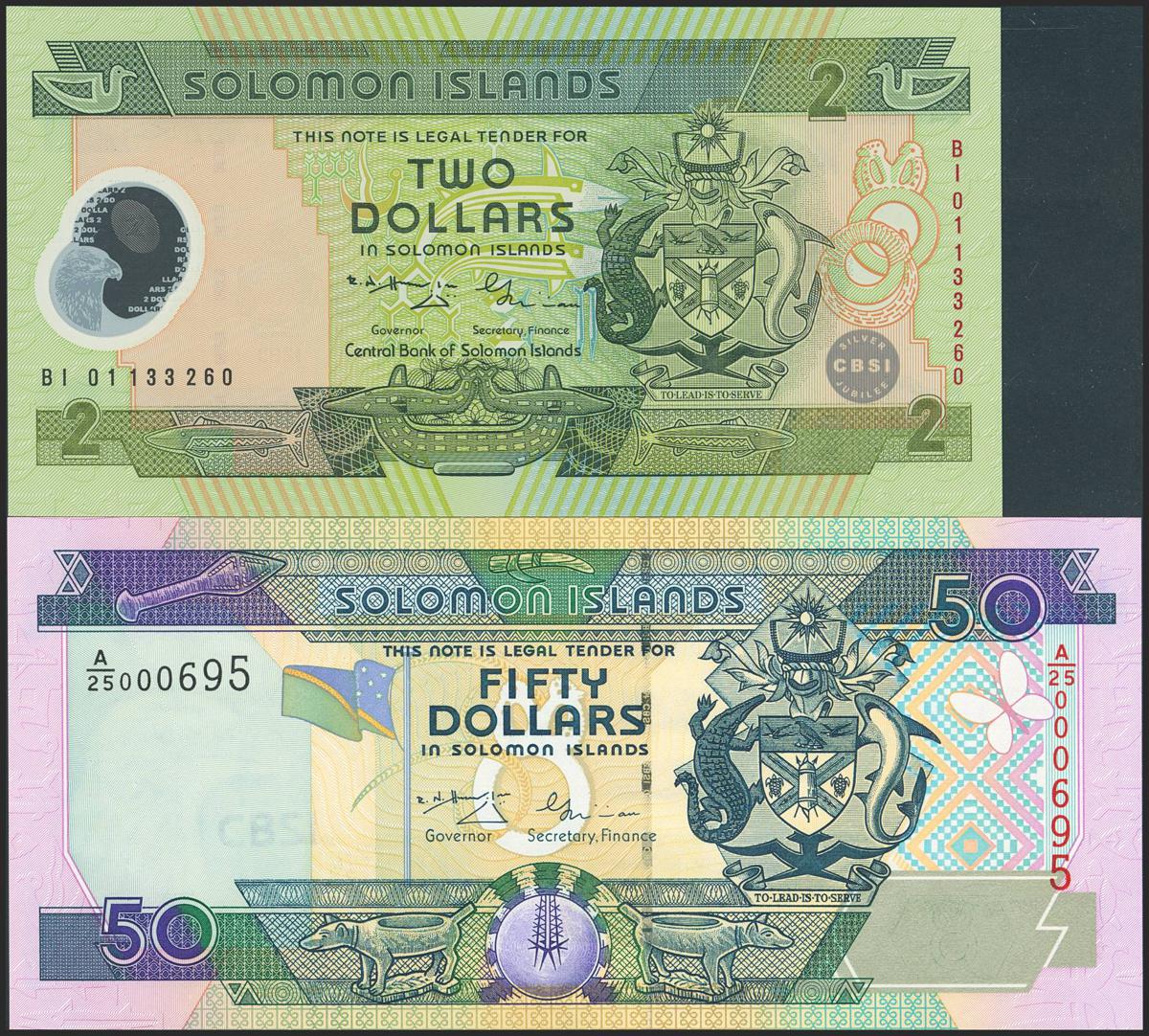 SOLOMON ISLANDS. Set of 2 notes of 2 Dollars and 50 Dollars. (2001ca). Central Bank. (Pick: 23, 24). Uncirculated.