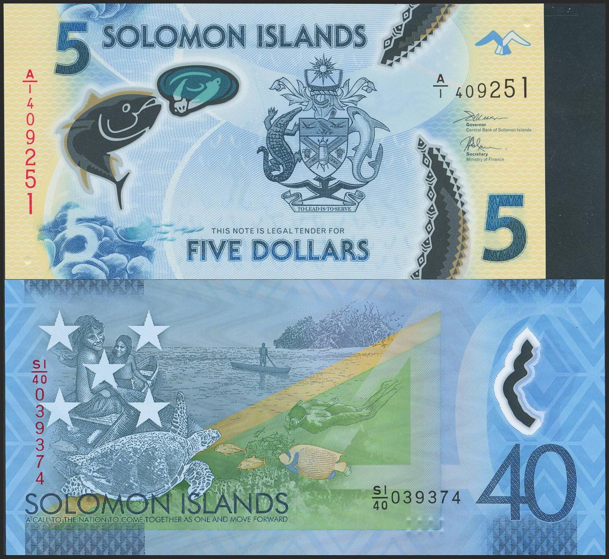 SOLOMON ISLANDS. Set of 2 notes of 5 Dollars and 40 Dollars. (2018ca). Central Bank. (Pick: 37, 38). Uncirculated.